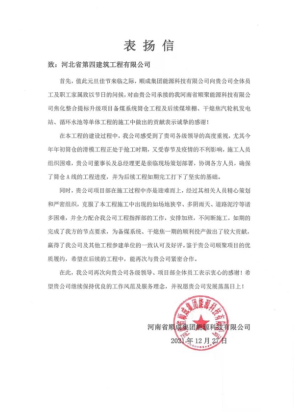 在表扬信中明确表达了在后续工程中与我公司再度紧密合作的诚意。在备煤系统筒仓工程施工中,项目部积极践行“团结、奋进、优质、高效”的企业精神,严格落实“两个以上单位在同一现场施工,河北四建必争第一”的要求,工程进度、施工质量、现场安全文明管理等方面均得到了业主、监理和其他参建单位的一致好评。业主方主动将60m精煤堆棚和200m火车卸煤堆棚交予我方施工,合同价款5000万元;堆棚工程保质保量完工后,业主方再次将干熄焦及汽轮发电循环水冷却塔、干熄焦及汽轮发电循环水泵房、汽轮机发电站工程交付我方施工,合同价款5600万元,真正做到了干好现场保市场。2021年6月7日,分公司党总支书记常健宇、项目经理祁淼受邀参加了河南顺成集团主办的合作单位签约暨项目推广会,公司从30多家施工单位中脱颖而出,被确定为河南顺成集团的长期合作伙伴,纳入优质合作企业名录,为双方今后深化合作奠定了基础。